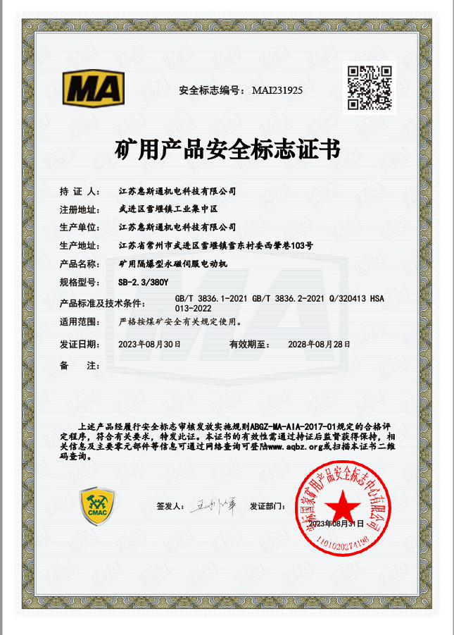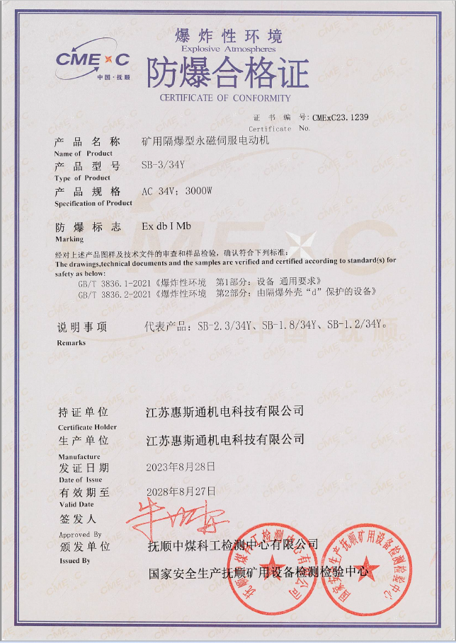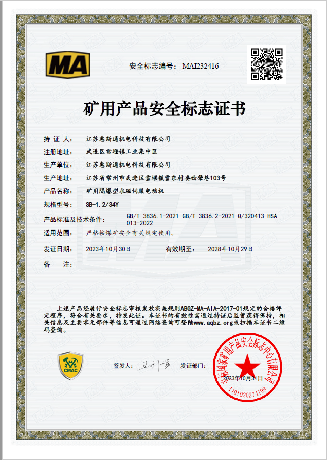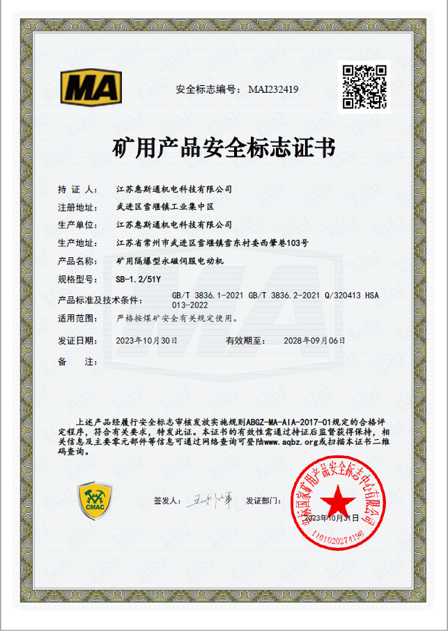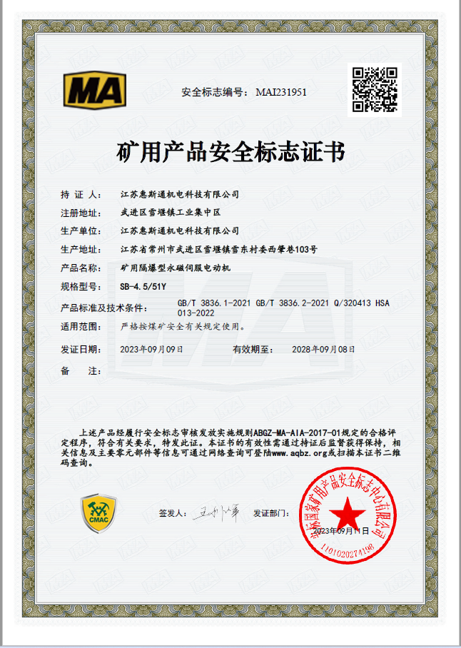 矿用隔爆型永磁伺服电动机证书1239