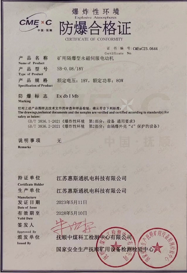 矿用隔爆型永磁伺服电动机证书0644