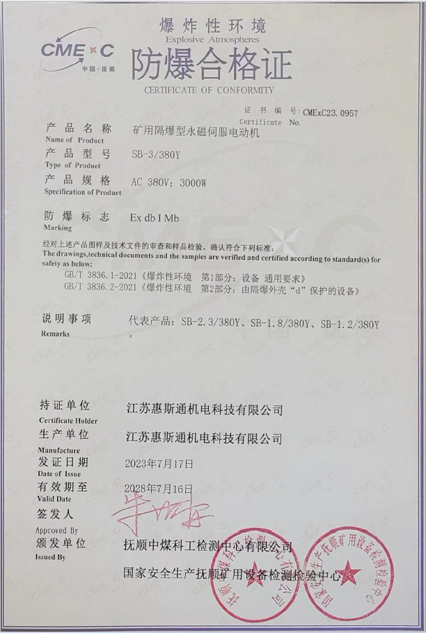 矿用隔爆型永磁伺服电动机证书0957