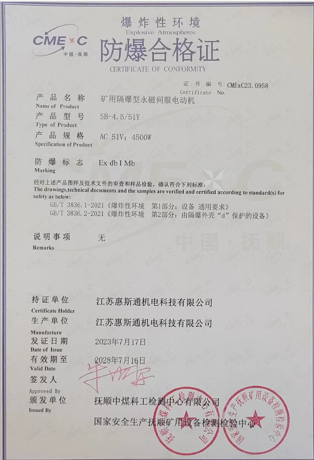 矿用隔爆型永磁伺服电动机证书0958