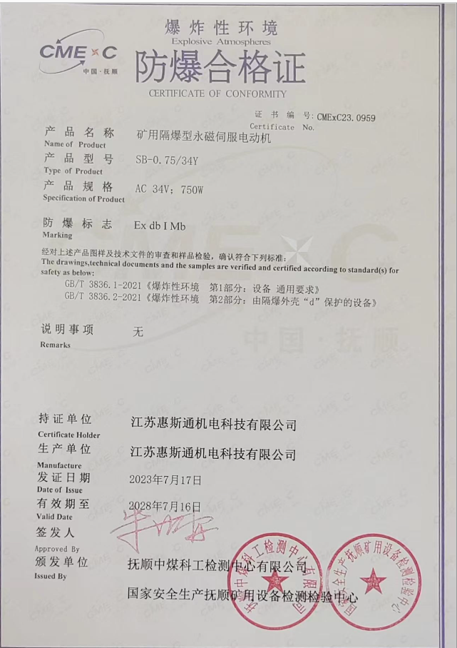 矿用隔爆型永磁伺服电动机证书0959