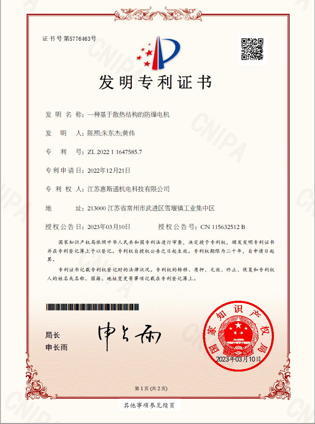1种基于散热结构的防爆电机发明专利证书
